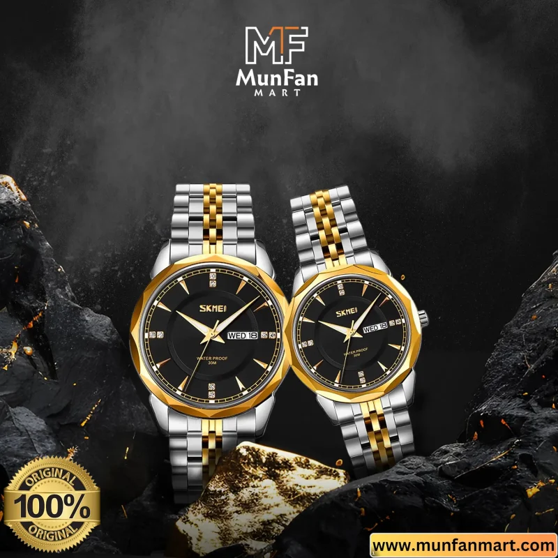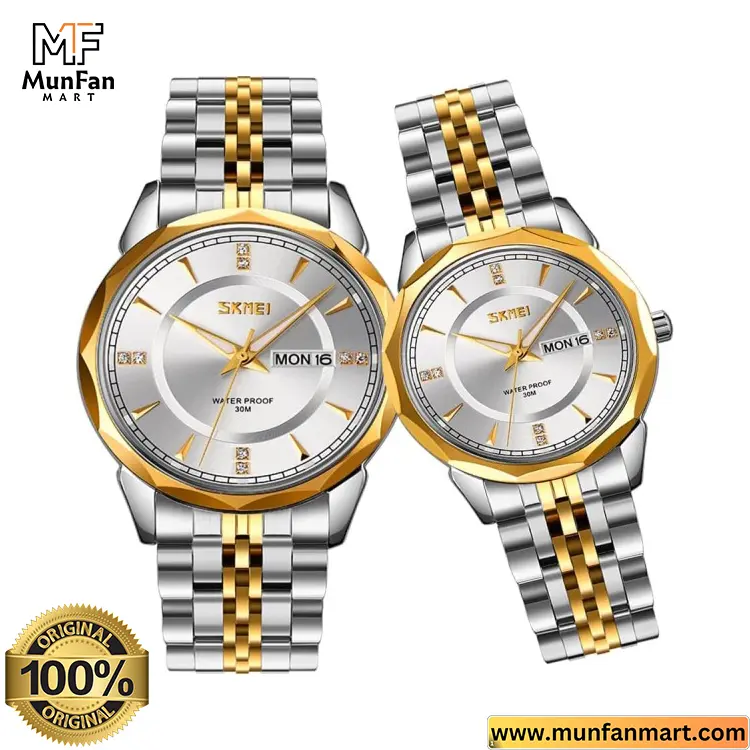 SKMEI 9268 Golden Silver Premium Luxury Couple Watch