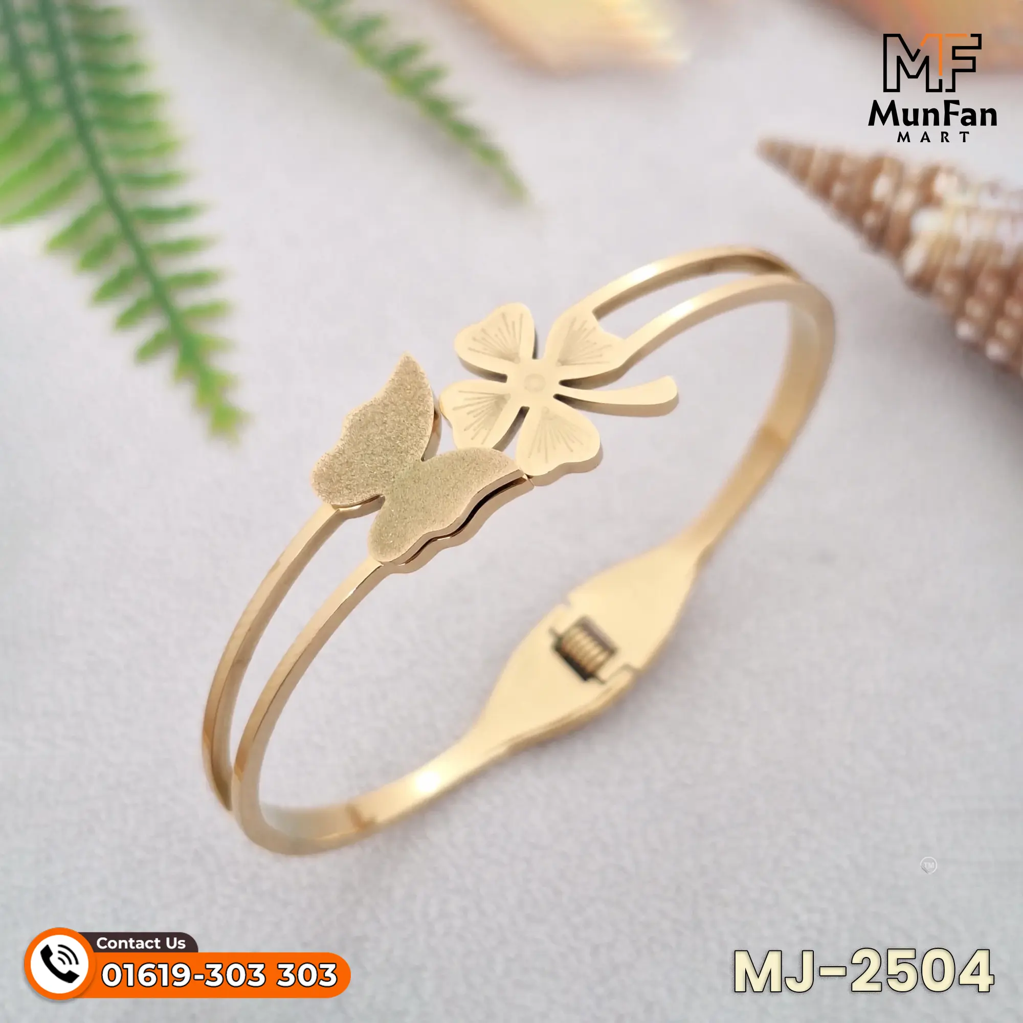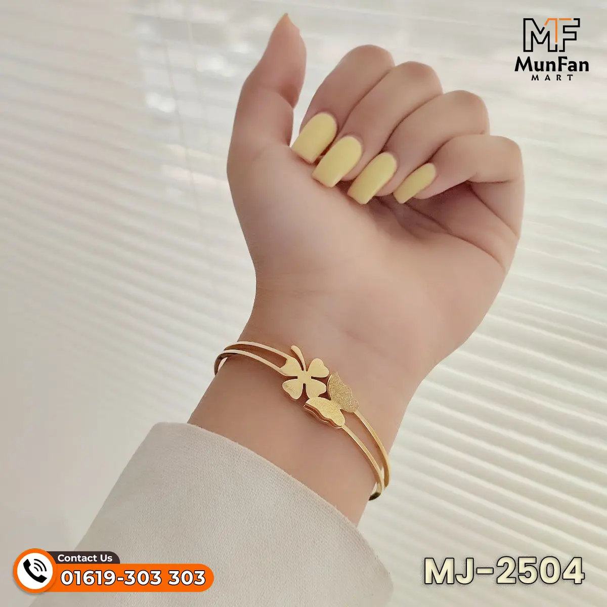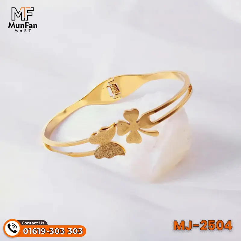 You desire a look of pure elegance. This bracelet brings style to your wrist. Gold plating shines with a rich glow. The butterfly design looks very natural today. Flowers add a soft and sweet touch. This jewelry piece fits every modern style. You look distinctive wearing this unique item. Fashion lovers admire this beautiful wrist accessory. MunFanMart.com offers this at a great price. The price is only 1,200৳ right now. It is the best deal in Bangladesh. Upgrade your collection with this luxury item. The model 2504 is a top choice. Gold-plated jewelry is trendy for women now.