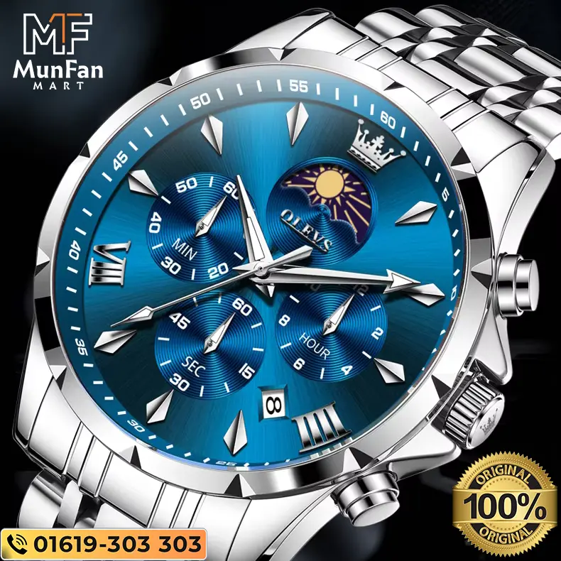 Buy OLEVS 3653 Silver Blue Quartz Watch at the best price in Bangladesh at Munfan Mart online store.